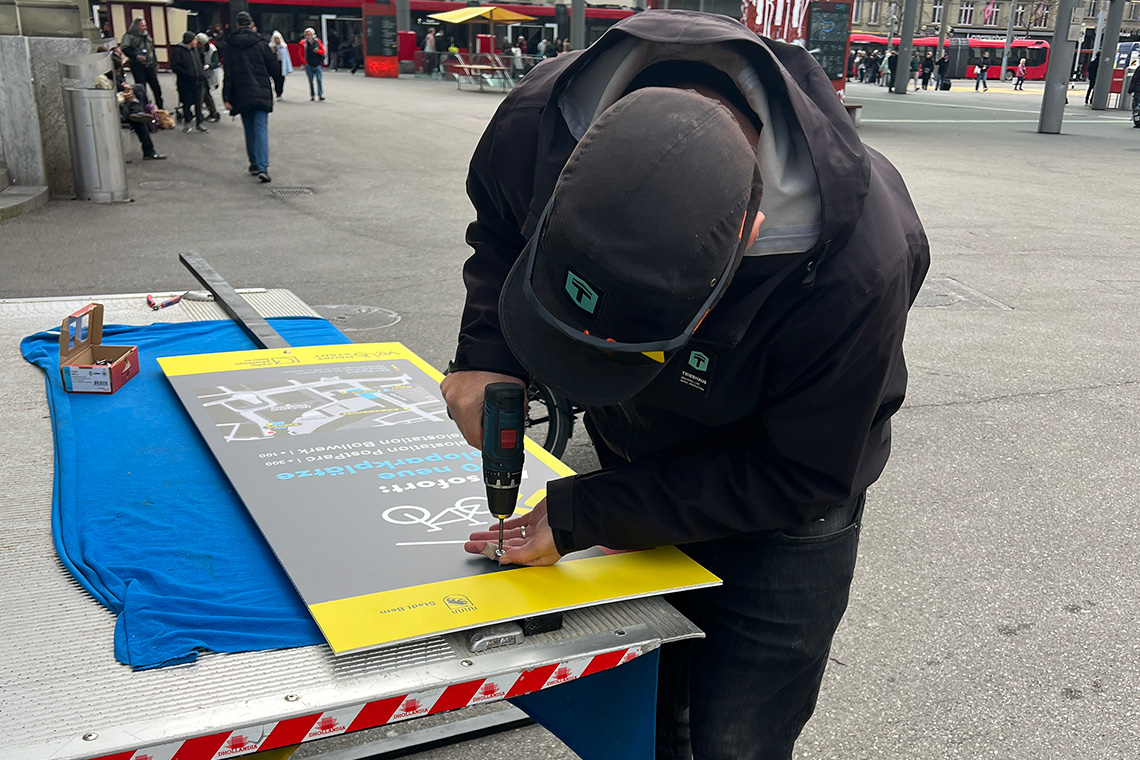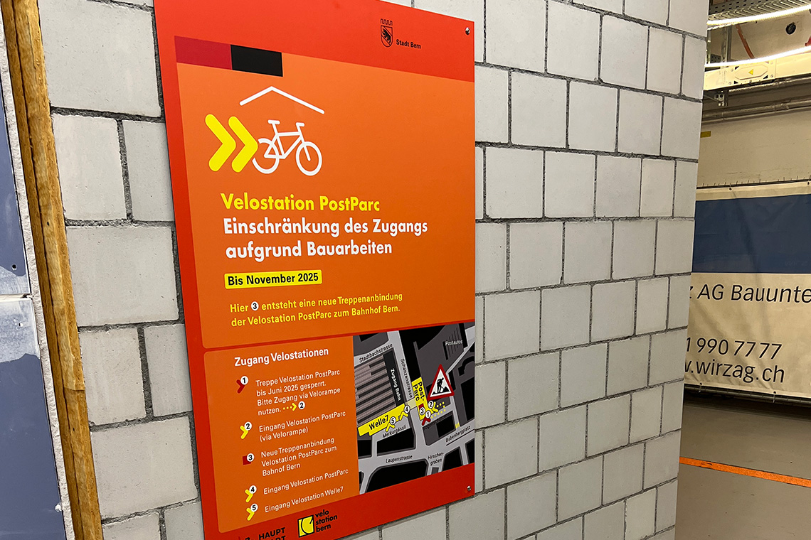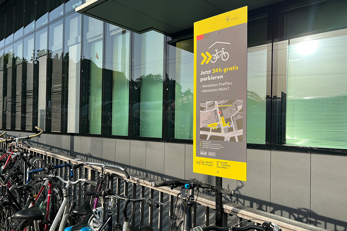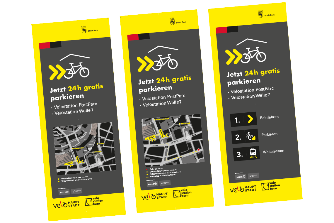 Um das den Berner:innen mitzuteilen, wurde TRIEBHAUS beauftragt, eine Kampagne zu lancieren. Es entstand eine temporäre Signaletik, die mit Pfeilen den Weg in Richtung Velostation weiste. Zudem entwickelte TRIEBHAUS diverse Kommunikationsmittel, darunter ein Logo und ein «How-to-gratis-parkieren». Spoiler: es isch bubi eifach.