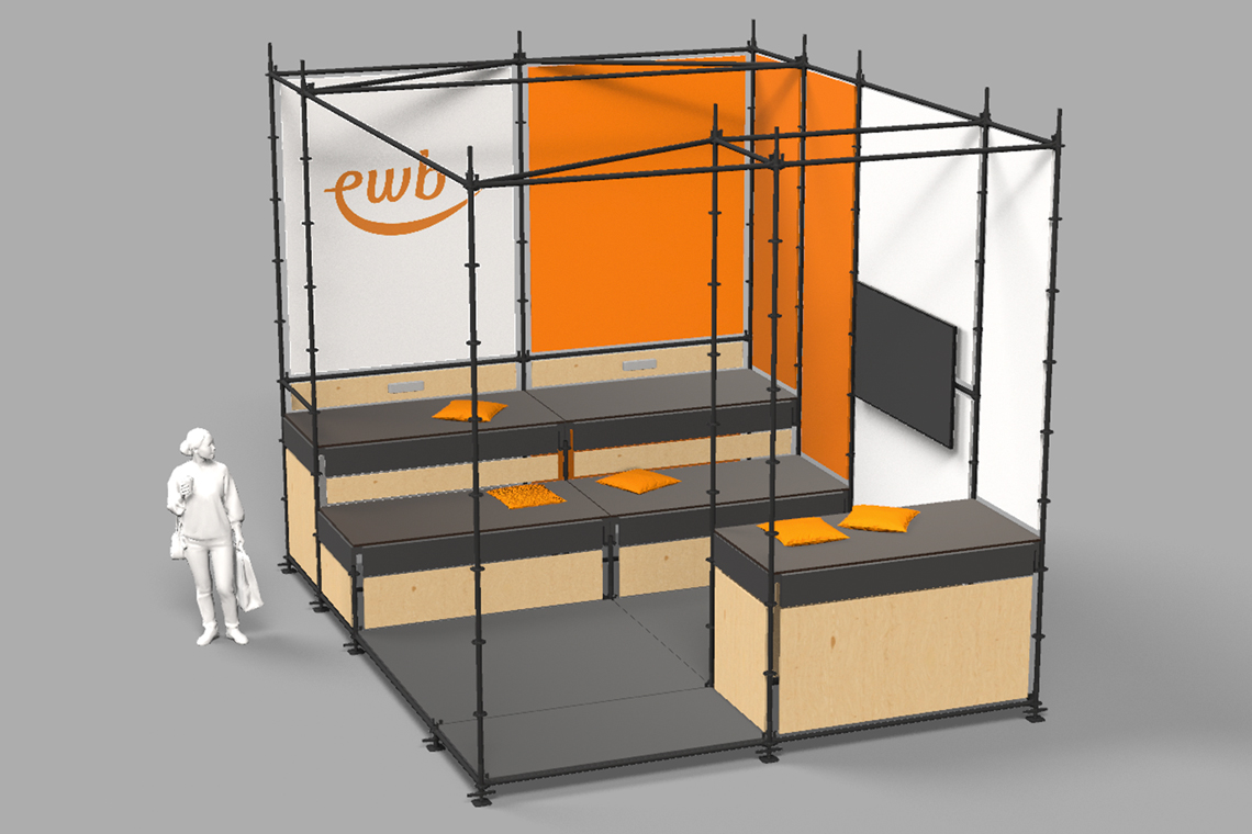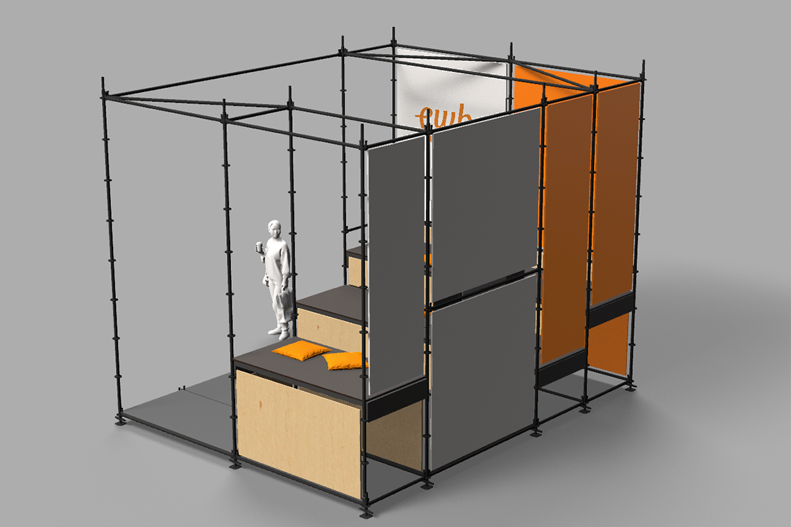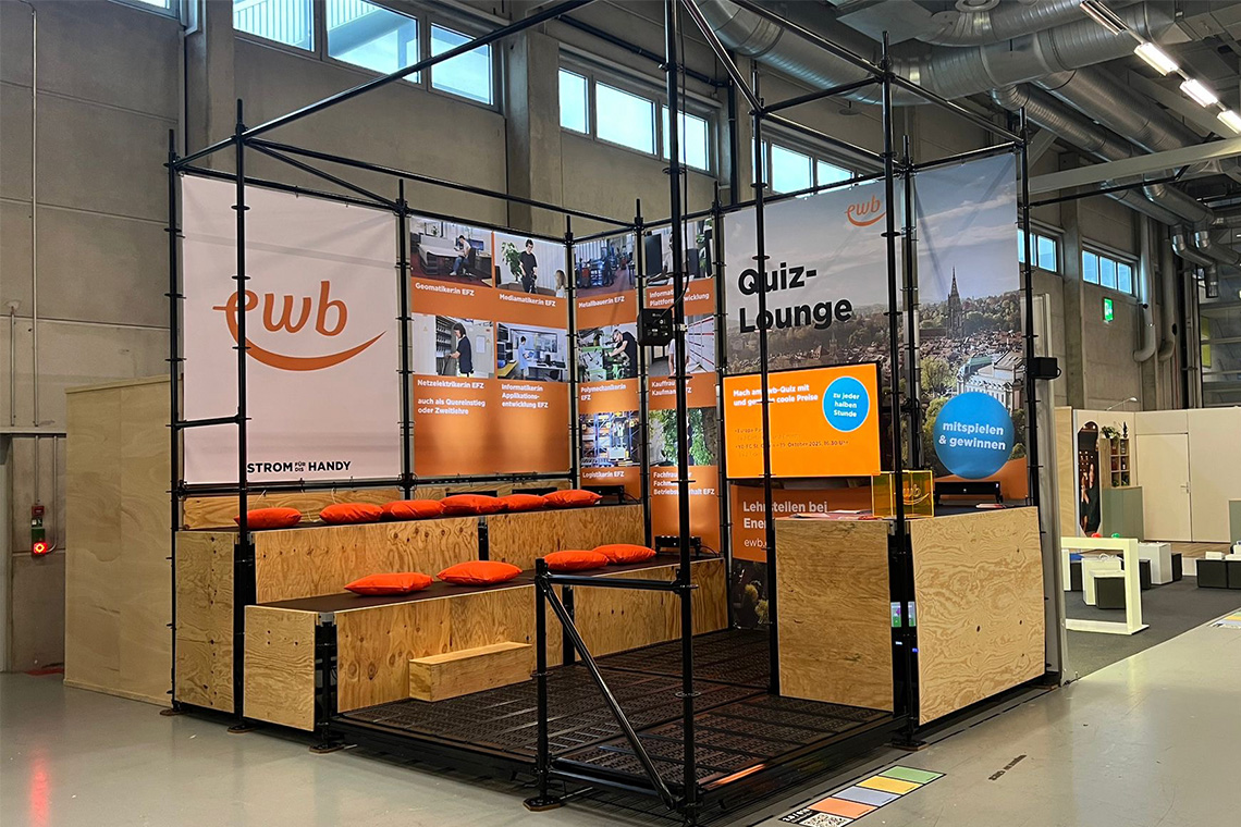 An der BAM kann man Lehrberufe erkunden, Firmen kennenlernen und sich über allerlei Dinge informieren. Was man aber an den meisten Ständen nicht kann, ist sitzen. Eifach chly höckle. Deshalb lag ein Fokus beim Konzept des Messestandes auf Sitzflächen, damit die Jugendlichen, nach all dem Rumgelatsche und Herumstehen auch mal etwas chillen konnten.