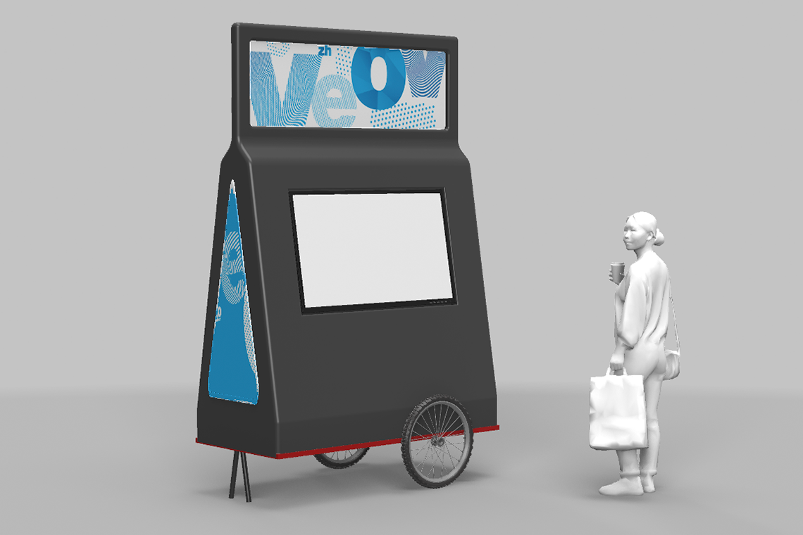 Einer ist mit einem Outdoor-Screen und einer PA, sprich einer kompletten Soundanlanlage ausgerüstet, ideal für informative Quizformate. Der nächste Trailer wurde mit Tablets vollgepackt, auf denen man etwa ein Game spielen kann. Super für Kids. Und der letzte ist quasi ein fahrendes Werbeplakat, auf welchem man seine Botschaften im wahrsten Sinne des Wortes transportieren kann.